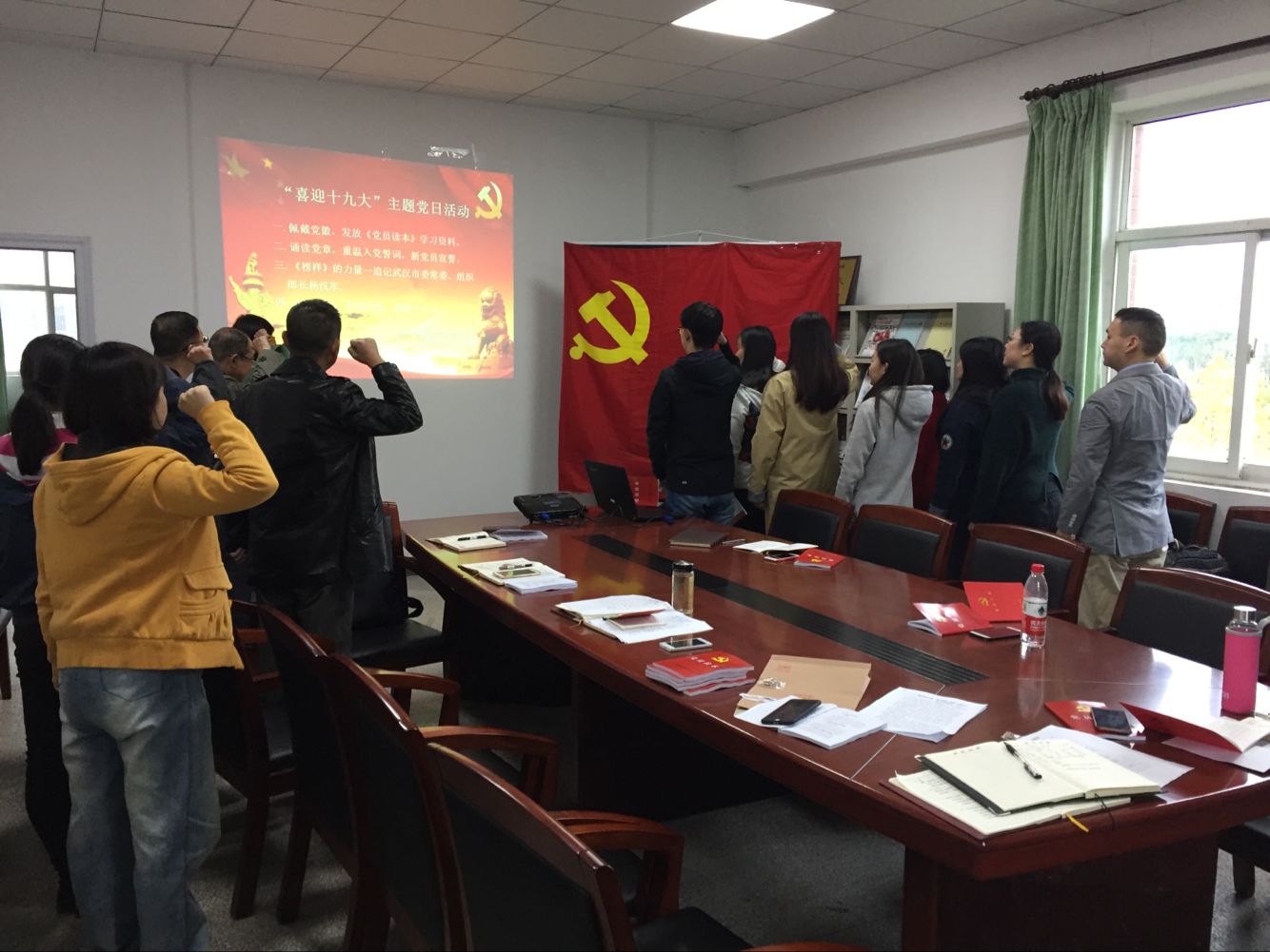 4名新入党的员工党员和全体教师党员在周荣荣同志的领誓下进行入党宣誓,重温入党誓词。