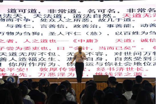 叶陈刚教授从bv伟德国际1946的校训讲起,阐述了诚信的重要性,强调:诚者,天之道也。希望同学们能以诚为本,鼓励同学们积极进取,奋发向上。期间还和同学们深入探讨了天道、人道、地道的内涵,指出,天道是诚、人道是善、地道是慈。