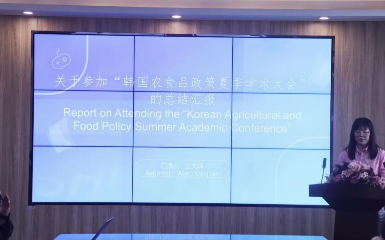 王文娟老师汇报了受邀参加韩国全北大学国际会议的情况,在对韩国农产品政策进行总结汇报后,针对农业补贴政策对产业的作用、食品安全标准国际化等专题展开深入研究,详细分析韩国的创新举措,同时交流不同国情下政策实施的经验与挑战,为公司今后在农食品政策研究和教学方面开辟新路径。
