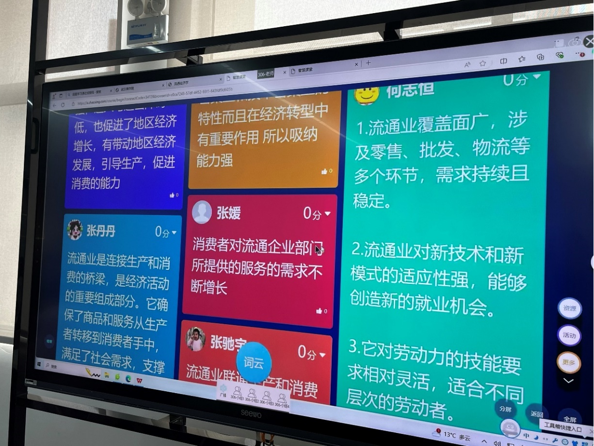 观摩课首先围绕流通业作为经济发展中的先导力量这一主题展开,之后根据流通业对GDP的贡献度,就业吸纳能力等方面进行深入讲解,为了提升教学质量并强化互动效果,观摩课运用行业数据分析流通业发展态势,采用了多种教学手段:既有师生间一对一的探讨,又有在线平台上的主题讨论,还组织了小组合作形式下的案例分析等。这些丰富多彩的授课形式不仅激发了同学们的积极性与主动性,还拓宽了同学们的专业视野,加深了其对专业知识的理解与掌握程度。