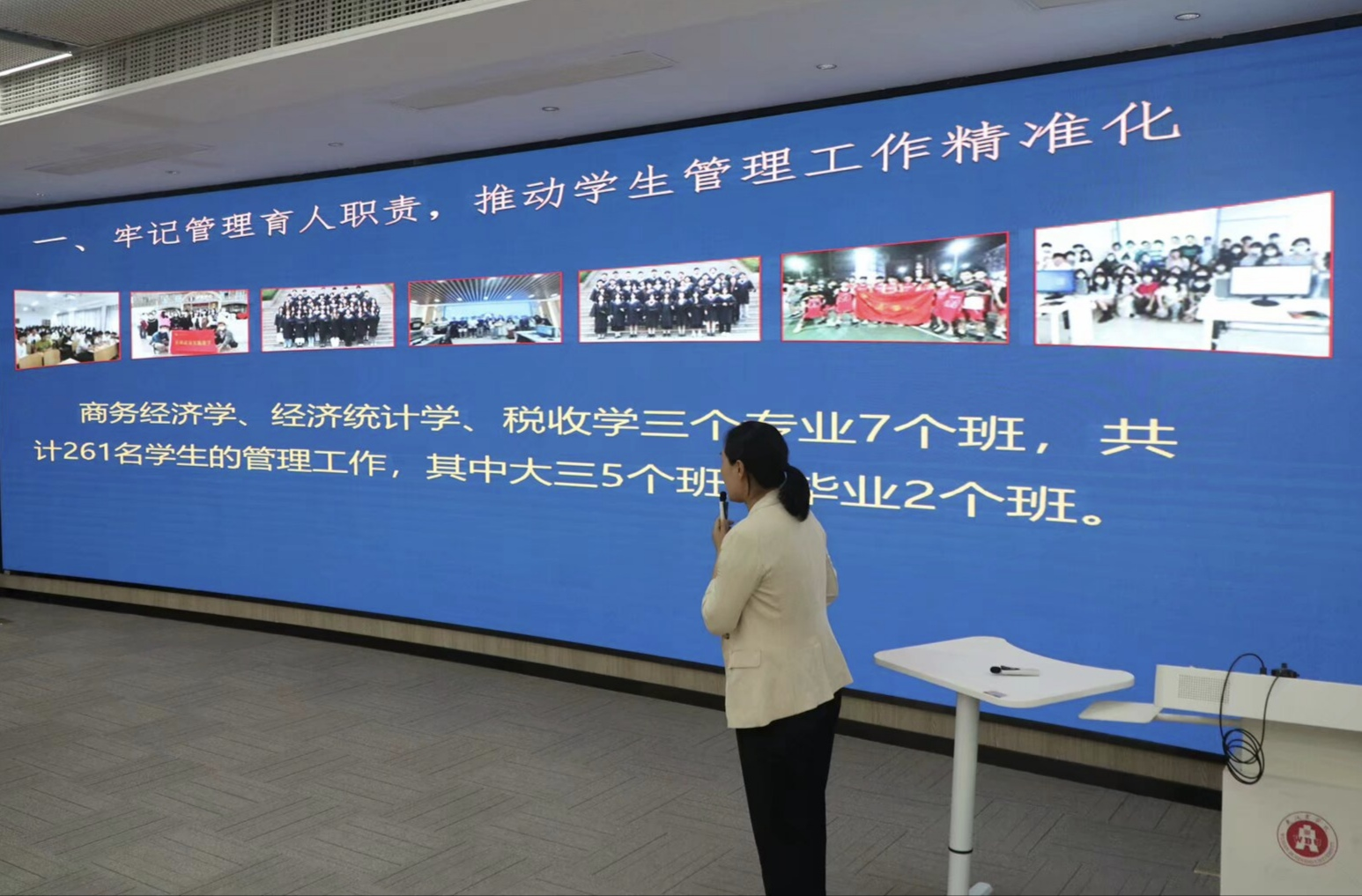 在演讲环节,王文娟博士围绕“教师支部工作开展”提出深刻思考,展现了党建引领下的教育使命;王竞、刘冰洁两位博士以“申硕攻坚”为核心,擘画学科发展蓝图,彰显了迎难而上的决心;吕侠博士立足专业特色,系统阐述税收学发展方向与创新举措;张波博士聚焦“国际商务规划”,强调职业引导与教学模式双轮驱动;刘静博士及段菁菁老师分别从教学、科研、团队建设三维度,为申硕决胜战注入智慧动能;韩未雪老师以“服务全局、协调各方、落实保障”为纲,诠释了党政综合办公室的护航作用;周荣荣、王瞻老师从辅导员视角出发,强调思想引领与班团管理并重,展现了师生共进的温情画卷;王甜甜老师以“精育启航,赋能成长”为主题,诠释精细化育人理念;国萌老师创新提出“三原色育人模型”与“胡杨模型”,为思政教育探索突围之路。现场思想交锋热烈,智慧火花频现。