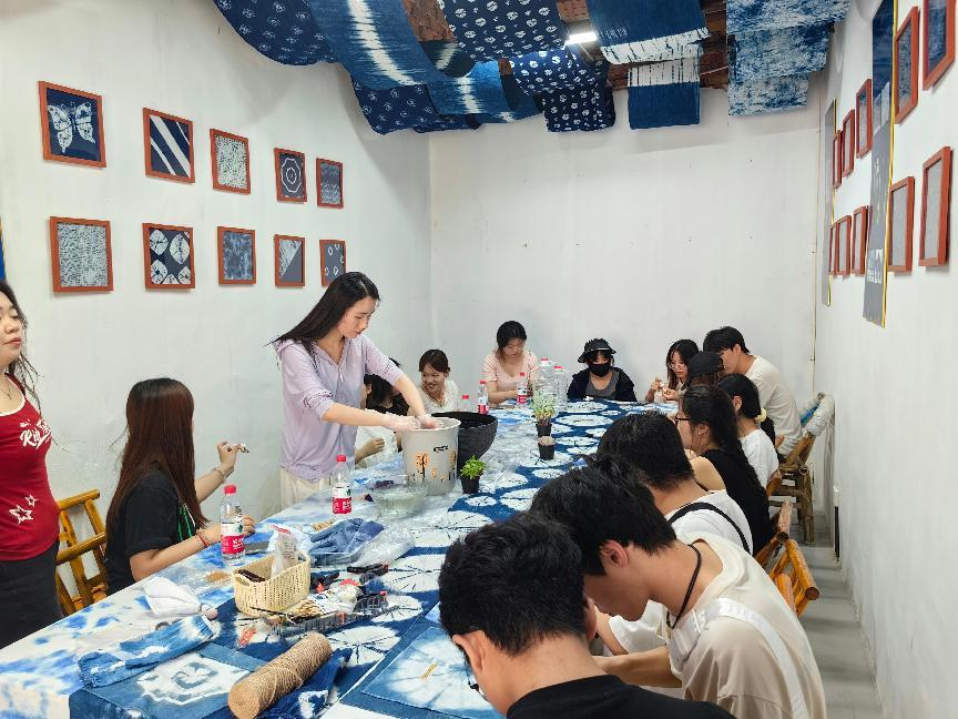 在参观了沼山村古村落的美丽环境后,同学一行去当地非遗文化草木扎染开展了体验活动,员工说:“当布料缓缓展开之前,就像拆开盲盒一样带着惊喜”。带队教师王瞻说:“读万卷书,行万里路,希望大家珍惜这一次的旅程,从美丽乡村的改变中感悟时代进步的力量,未来去祖国需要的地方奉献自己的才智”。此外,本次活动由22级退役老员工杨超、李长乐担任活动的安全员和团建活动的教官,带领员工开展破冰游戏、徒步拓展等活动,发挥了退役老员工的朋辈引导作用,也加强了员工的凝聚力,共同诠释了成长共同体理念。